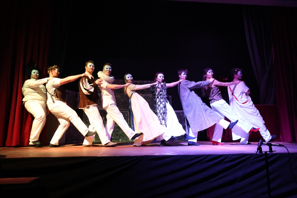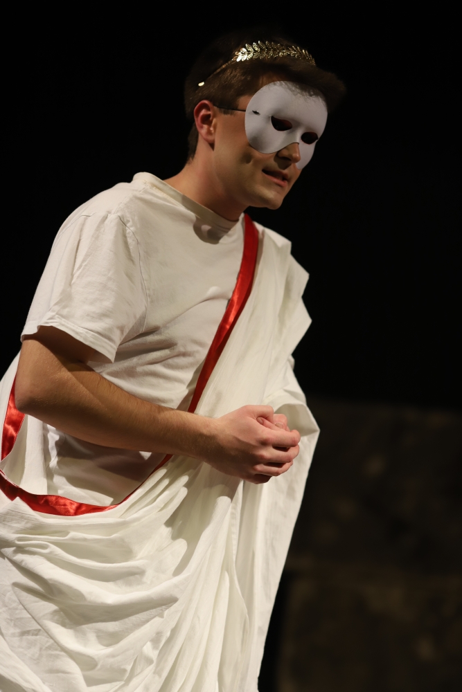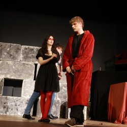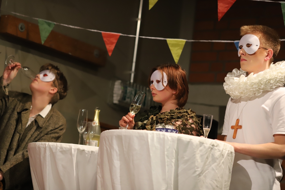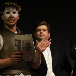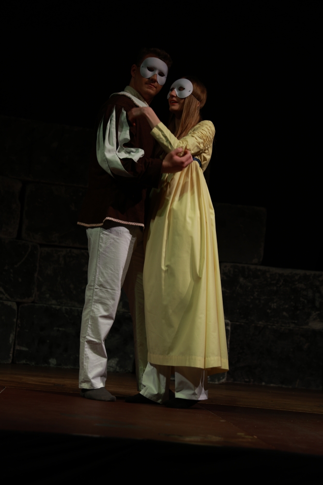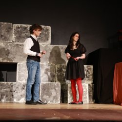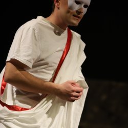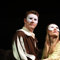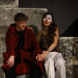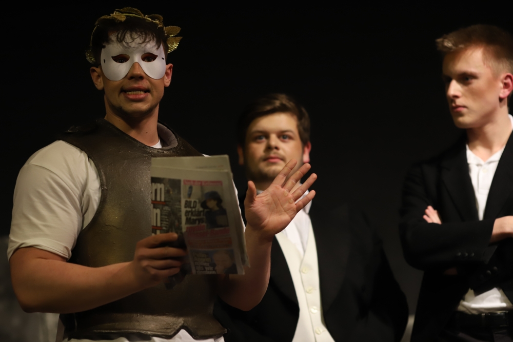 Doch jetzt gerade ist es geheimnisvoll, wir befinden uns nämlich mit einem Mal auf dem Ball des chinesischen Kaisers, zu dem die Figuren der Vergangenheit nun nach und nach eintrudeln. Zunächst erscheinen Romeo und Julia. Das noch hoffnungsvolle Paar erinnert an das Wesen der Menschen: Liebe und Zuversicht schwingen in dem Auftritt der beiden mit (Lena Jendrysik verkörpert Julia auf schüchterne, keusche Weise; Viktor Reichert offenbart ihr mit seiner nachdenklichen Romeo-Darstellung Schutz). Doch ihre Liebesbezeugung wird von einer Stimme aus dem Off unterbrochen, die zur Polonaise auf der Terrasse einlädt, und mit einem Mal ist man mitten drin in der Farce dieses Maskenballs, der nun zu einer dynamisch-rhythmischen Musik im Stil einer modernen Polonaise alle Masken auf den Plan ruft und in ihren individualisierten Posen einfrieren lässt. Der Heutige, gleichfalls mit von der Partie wird im Folgenden mit der ein oder anderen Maske näher ins Gespräch kommen und sie auf ihre Bedeutung und ihre Ziele, ihre Fehler und die Lehren, die aus ihrer Existenz gezogen wurden, aufmerksam machen. Neben Napoleon (in typischer Pose sicher gespielt von Sinan Graf) tauchen da noch Columbus und Pontius Pilatus auf. Der eine ist immer noch entsetzt darüber, dass er nicht Amerika, sondern Indien entdeckt hat (Johanna Gerike stellt Columbus dabei stimmig als langsamen, dattrigen, alten Greis gestützt auf einem Gehstock dar), während Pontius Pilatus (engagiert zweifelnd von Christopher Schmidt präsentiert) über die Frage nach der Wahrheit sinniert. L‘Inconnue de la Seine ist es schließlich, die mit ihrer leichtfüßigen, beschwingten Art (überzeugend auch in dieser Rolle: Johanna Losgar) Stimmung auf die Party zaubert und alle mit Sekt versorgt, obwohl ihr eigenes Schicksal ja letztlich kein Grund zum Feiern sein dürfte – schwanger, an Tuberkulose erkrankt und zuletzt tot in der Seine gefunden – doch noch glauben wir ihr das nicht – Hoffnung flammt auf. Da gibt es ja auch noch den erbost dynamischen Brutus, der immerhin die Republik verteidigte. Eric Artes, der an diesem Abend sehr körperlich in ganz viele kleinere Rollen schlüpft (z.B. Ausrufer oder auch Scharfrichter des Kaisers) präsentiert diesen „Verteidiger der gerechten Sache“ – Mord an Caesar hin oder her - echauffiert und aufgeregt. Cleopatra kann diese Theatralik gar nicht verstehen – sie ist hier ganz Frau von Welt, die zielsicher das Umfeld der Macht sucht. Emily Weiß vermittelt auch hier durch klare Körpersprache die souveräne, unaufgeregte Haltung einer verführerischen Herrscherin. Was Verführungen angeht, kennt sich auch der nächste Gast aus: Don Juan. Viktor Reichert gibt auch diesen Helden, der betrübt darüber ist, dass sich die Nachwelt sich ihr ganz eigenes Bild von ihm gemacht hat, dynamisch und selbstbewusst. Ein Duktus, der auch den Weltenbeherrscher Philipp von Spanien umgibt, der von Tobias Steinhäuser ganz klar und sicher im Gestus, als streng religiöser Fanatiker präsentiert wird.