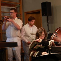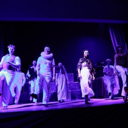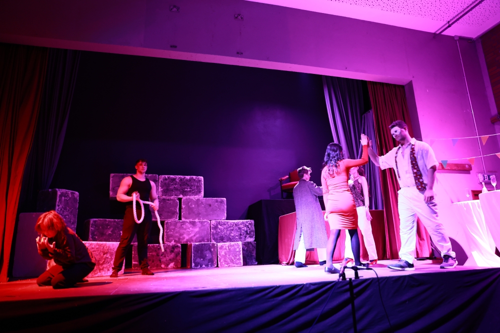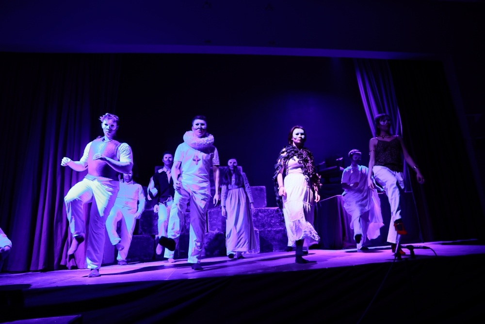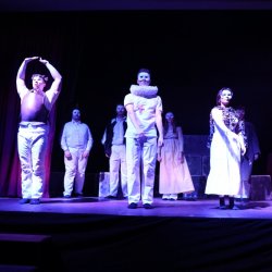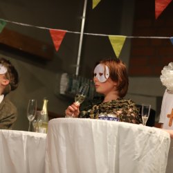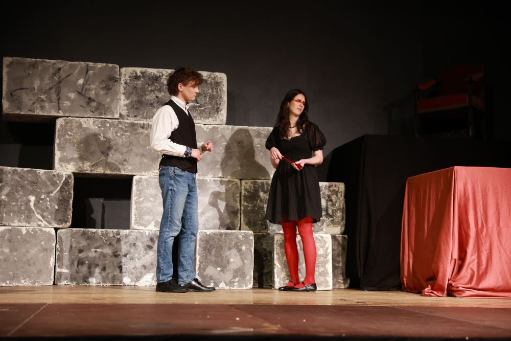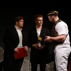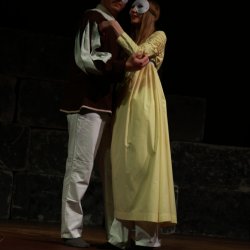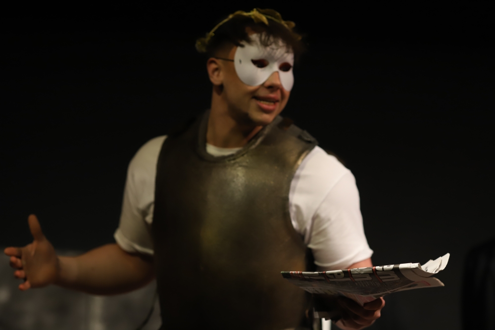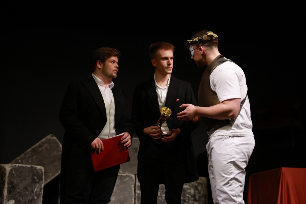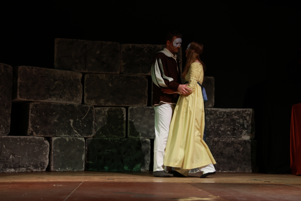 Doch jetzt gerade ist es geheimnisvoll, wir befinden uns nämlich mit einem Mal auf dem Ball des chinesischen Kaisers, zu dem die Figuren der Vergangenheit nun nach und nach eintrudeln. Zunächst erscheinen Romeo und Julia. Das noch hoffnungsvolle Paar erinnert an das Wesen der Menschen: Liebe und Zuversicht schwingen in dem Auftritt der beiden mit (Lena Jendrysik verkörpert Julia auf schüchterne, keusche Weise; Viktor Reichert offenbart ihr mit seiner nachdenklichen Romeo-Darstellung Schutz). Doch ihre Liebesbezeugung wird von einer Stimme aus dem Off unterbrochen, die zur Polonaise auf der Terrasse einlädt, und mit einem Mal ist man mitten drin in der Farce dieses Maskenballs, der nun zu einer dynamisch-rhythmischen Musik im Stil einer modernen Polonaise alle Masken auf den Plan ruft und in ihren individualisierten Posen einfrieren lässt. Der Heutige, gleichfalls mit von der Partie wird im Folgenden mit der ein oder anderen Maske näher ins Gespräch kommen und sie auf ihre Bedeutung und ihre Ziele, ihre Fehler und die Lehren, die aus ihrer Existenz gezogen wurden, aufmerksam machen. Neben Napoleon (in typischer Pose sicher gespielt von Sinan Graf) tauchen da noch Columbus und Pontius Pilatus auf. Der eine ist immer noch entsetzt darüber, dass er nicht Amerika, sondern Indien entdeckt hat (Johanna Gerike stellt Columbus dabei stimmig als langsamen, dattrigen, alten Greis gestützt auf einem Gehstock dar), während Pontius Pilatus (engagiert zweifelnd von Christopher Schmidt präsentiert) über die Frage nach der Wahrheit sinniert. L‘Inconnue de la Seine ist es schließlich, die mit ihrer leichtfüßigen, beschwingten Art (überzeugend auch in dieser Rolle: Johanna Losgar) Stimmung auf die Party zaubert und alle mit Sekt versorgt, obwohl ihr eigenes Schicksal ja letztlich kein Grund zum Feiern sein dürfte – schwanger, an Tuberkulose erkrankt und zuletzt tot in der Seine gefunden – doch noch glauben wir ihr das nicht – Hoffnung flammt auf. Da gibt es ja auch noch den erbost dynamischen Brutus, der immerhin die Republik verteidigte. Eric Artes, der an diesem Abend sehr körperlich in ganz viele kleinere Rollen schlüpft (z.B. Ausrufer oder auch Scharfrichter des Kaisers) präsentiert diesen „Verteidiger der gerechten Sache“ – Mord an Caesar hin oder her - echauffiert und aufgeregt. Cleopatra kann diese Theatralik gar nicht verstehen – sie ist hier ganz Frau von Welt, die zielsicher das Umfeld der Macht sucht. Emily Weiß vermittelt auch hier durch klare Körpersprache die souveräne, unaufgeregte Haltung einer verführerischen Herrscherin. Was Verführungen angeht, kennt sich auch der nächste Gast aus: Don Juan. Viktor Reichert gibt auch diesen Helden, der betrübt darüber ist, dass sich die Nachwelt sich ihr ganz eigenes Bild von ihm gemacht hat, dynamisch und selbstbewusst. Ein Duktus, der auch den Weltenbeherrscher Philipp von Spanien umgibt, der von Tobias Steinhäuser ganz klar und sicher im Gestus, als streng religiöser Fanatiker präsentiert wird.