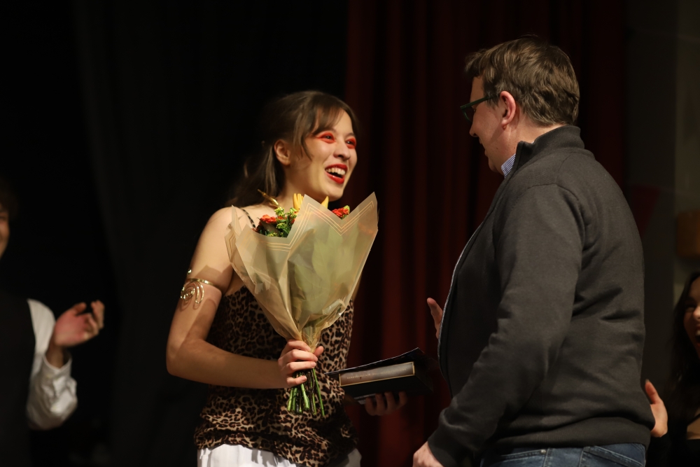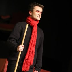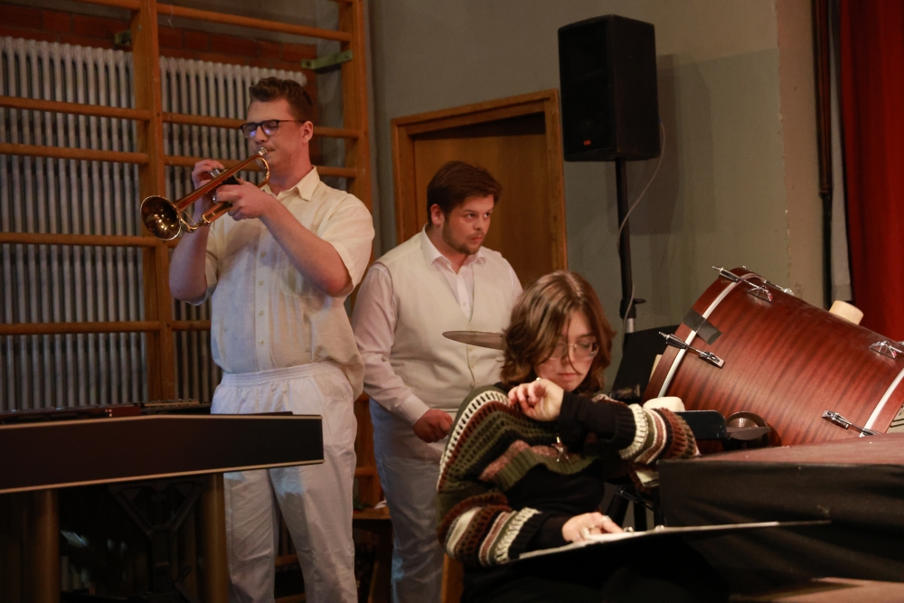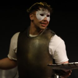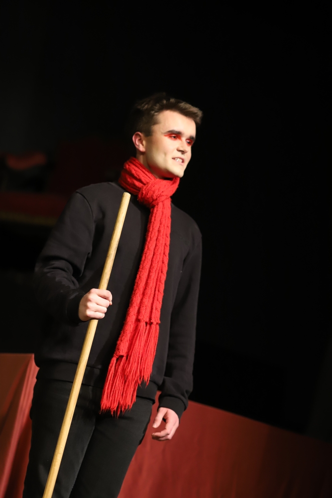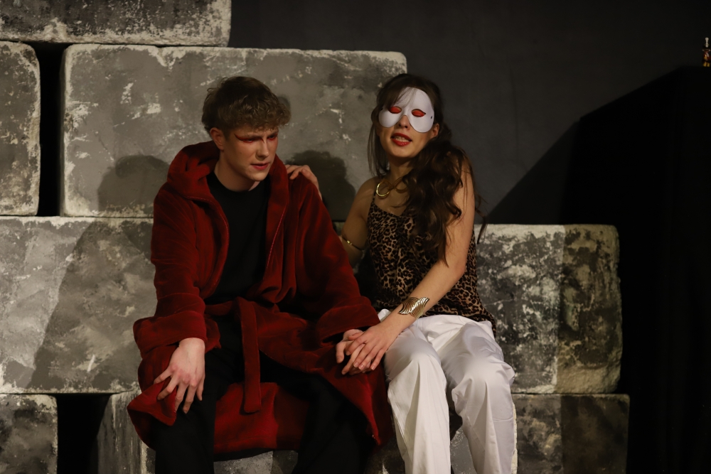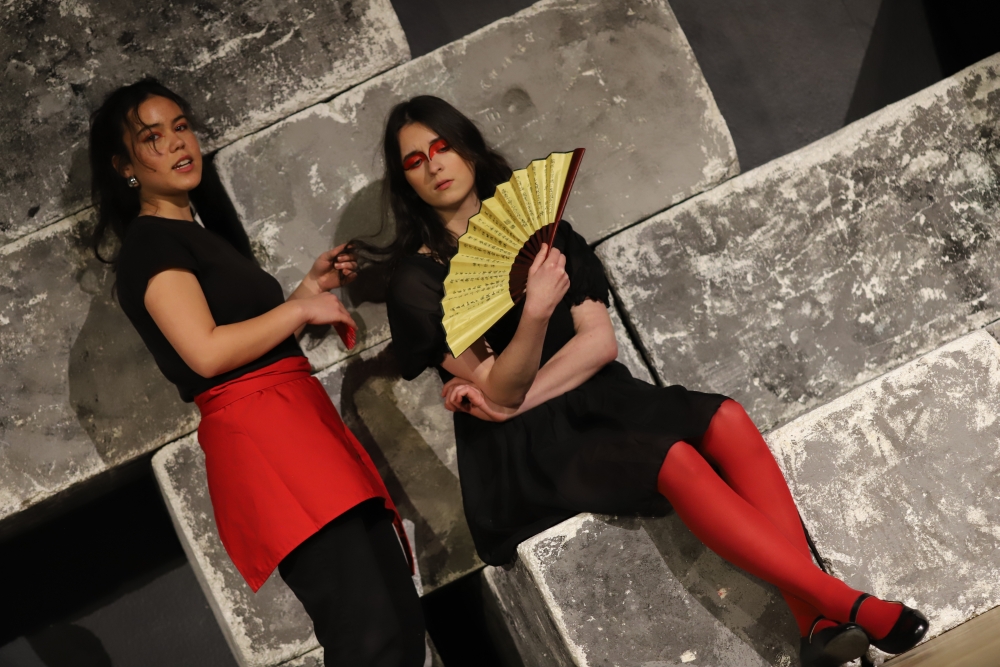 Szenenwechsel – der bisher geschlossene Vorhang öffnet sich – man erblickt einen Ausschnitte einer aus gigantischen grauen Blöcken gebildeten Mauer – daneben einen auf einem roten Podest erhobenen Thron, der über alles ragt. Überhaupt sind Bühnenbild und Kostüme, Requisiten und Masken auf faszinierende Weise bis ins letzte Detail durchchoreographiert – die Farben des Abends bleiben rot, schwarz und weiß – die Vertreter des chinesischen Volkes sind eindrucksvoll mit rotem Augen-Makeup gekennzeichnet (den versierten Macherinnen von Make-Up und Kostüm, Gina Rose Cotton und Kayla Silva-Bößert, sei Dank), die Masken der Vergangenheit tragen erkennbar nuancierte zeittypische Gewänder und tatsächlich weiße Masken. Der intellektuelle Heutige trägt Sakko, Hemd und Jeans, die Zigarette wird als lässiges Accessoire präsentiert – nichts wird dem Zufall überlassen – alles ist ins letzte Detail stimmig unterlegt - Licht und Tontechnik inklusive: die ganzen Szenen des Stücks werden durch das Technik-Team (Sebastian Losgar, Alwin Hellwich, Jonathan Wiegandt, Noah Kießling, Diana Weinbrecht und Johanna Losgar) gekonnt ausgeleuchtet und vertont. Es tragen aber auch live eingespielte Sound- und Musikpassagen (Victor Reichert und Sinan Graf) zur geheimnisvollen oder oftmals auch militärischen Atmosphäre der einzelnen Szenen bei.