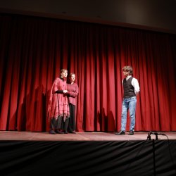 Der Prinz Wu Tsian ist es, der den Kaiser über diesen Aufruhr des Volkes informiert. Er ist es, der das Spiel der Mächtigen gleichfalls durchschaut hat und wütend wird ob der leeren Versprechen (Ehe mit der Königstochter, Anwärter auf Nachfolge des Kaisers etc.), mit denen er hingehalten wird – auch von der Königstochter, die ihn, wie alle anderen Anwärter zuvor klar in seine Schranken weißt, jetzt, wo der spannendende Heutige aufgetaucht ist. Johanna Gerike spielt diesen männlichen Anwärter auf den Thron noch etwas zweifelnd, noch erscheint der Prinz zu sympathisch, als dass die Drohungen, die er ausspricht, um die Kaisertochter für sich zu gewinnen, überzeugend wirken. Der Kaiser ist jedenfalls verzweifelt über die Proteste im Volk bzw. die Stimme des Volkes – Moment, war verzweifelt, denn jetzt ist die Stimme des Volkes ja gefasst, der Prozess wird gemacht – nach der Pause.