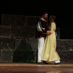 Waren es zuletzt die Masken Brutus oder „Frack & Cut“, die wie die Alten vom Balkon der Muppet-Show (Sinan Graf und Tobias Steinhäuser sind hier noch einmal passend präsent unterwegs) in die Szenerie eingreifen? Man weiß es am Ende gar nicht mehr – das Spiel der Masken setzt wieder ein – stilisiert, abstrus und unheimlich. Nur die Unschuld von Romeo und Julia, die noch einmal kurz zu Wort kommen dürfen – lassen trotz aller Hoffnungslosigkeit: „Ist denn kein Ort für unsrer Liebe Glück?“, gerade deswegen doch Hoffnung entstehen: „Oh Welt! Wir lieben dich; du sollst nicht untergehen.“