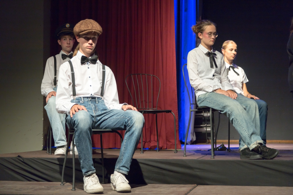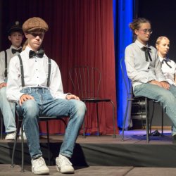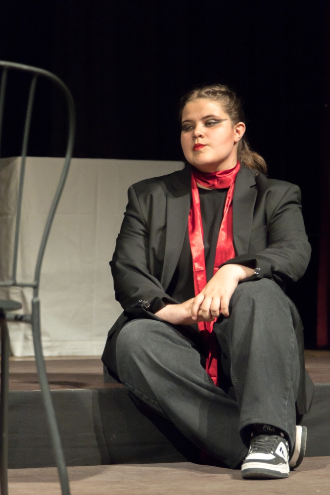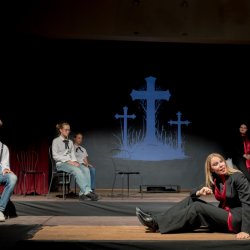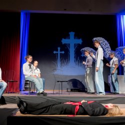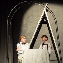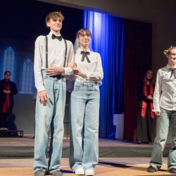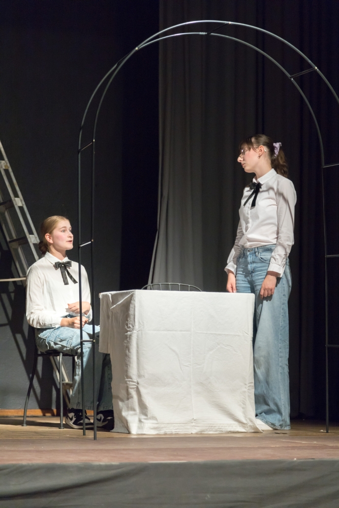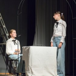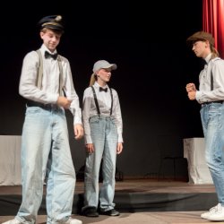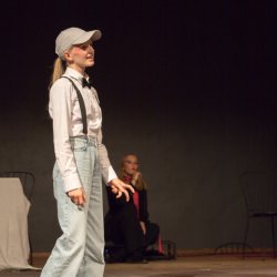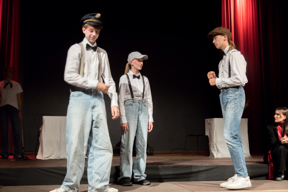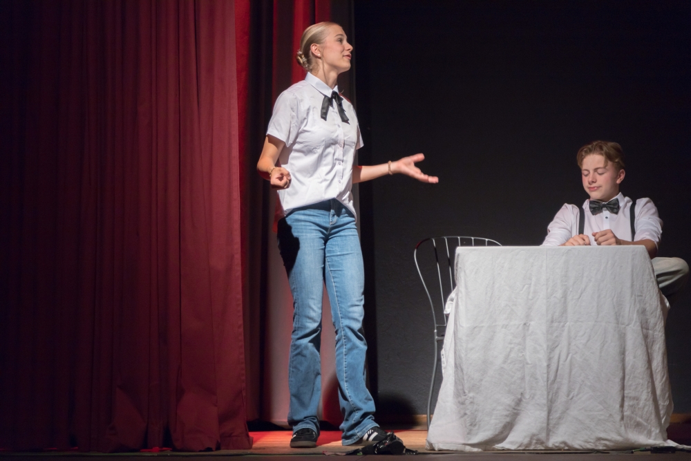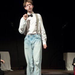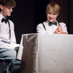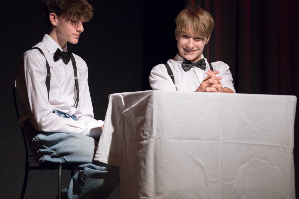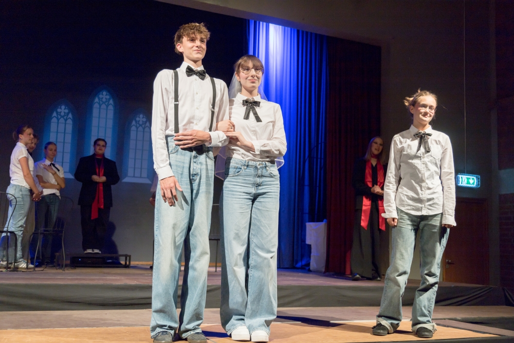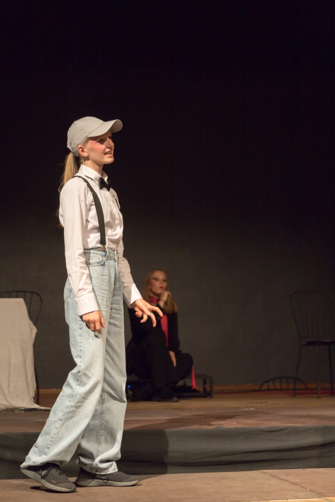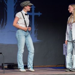 Unterstützt wird das auf wenige Requisiten reduzierte Setting der Stadt dann aber doch durch gekonnte Licht- und Tontechnik. So erscheint die Bühne – ja nach Stimmungslage – lichttechnisch verwandelt: Morgendämmerung, selbstverständliches Alltagslicht, aber auch romantische Abendstimmungen oder Trauerstimmung vermag das Technikteam mit Leichtigkeit (so scheint es jedenfalls) stets passend zu kreieren. Im Einsatz sind dieses Mal engagiert das Technikteam unter der Leitung von Noah Kießling, unterstützt von Jonas Ulrich. Aber auch die musikalische Untermalung des Stücks wird diesen Abend auf ganz besondere Weise gelingen: Yeva Kravets vermag es mit Hörspiel-Akustik stets für die passende Geräuschkulisse zu sorgen – so hört man beispielsweise das Spülen und Klappern von Geschirr oder aber nimmt den Aufprall geworfener Zeitungen war – und ist das nicht sogar eine Nachtigall, die da singt? Der Zuhörer lässt sich überraschen und ist gleichfalls erfreut über das einheitliche Dress der Städter (passend gewählt für die amerikanische Kleinstadt: Blue Jeans, weißes Hemd und schwarze Schleife) sowie das gekonnte Make-Up, das es schafft einen einheitlichen Akzent in die Gesichter der Städter zu zaubern, der nicht übertrieben, aber doch deutlich gleichförmig gestaltet ist. Josephine Zsigmond und Grete Staudigel zeichnen sich hinter der Bühne für dieses gelungene Spiel mit der Alltäglichkeit verantwortlich. Aber nun zurück zum Spiel: