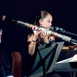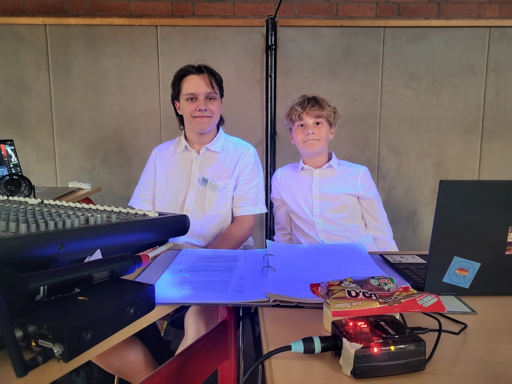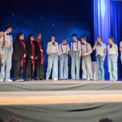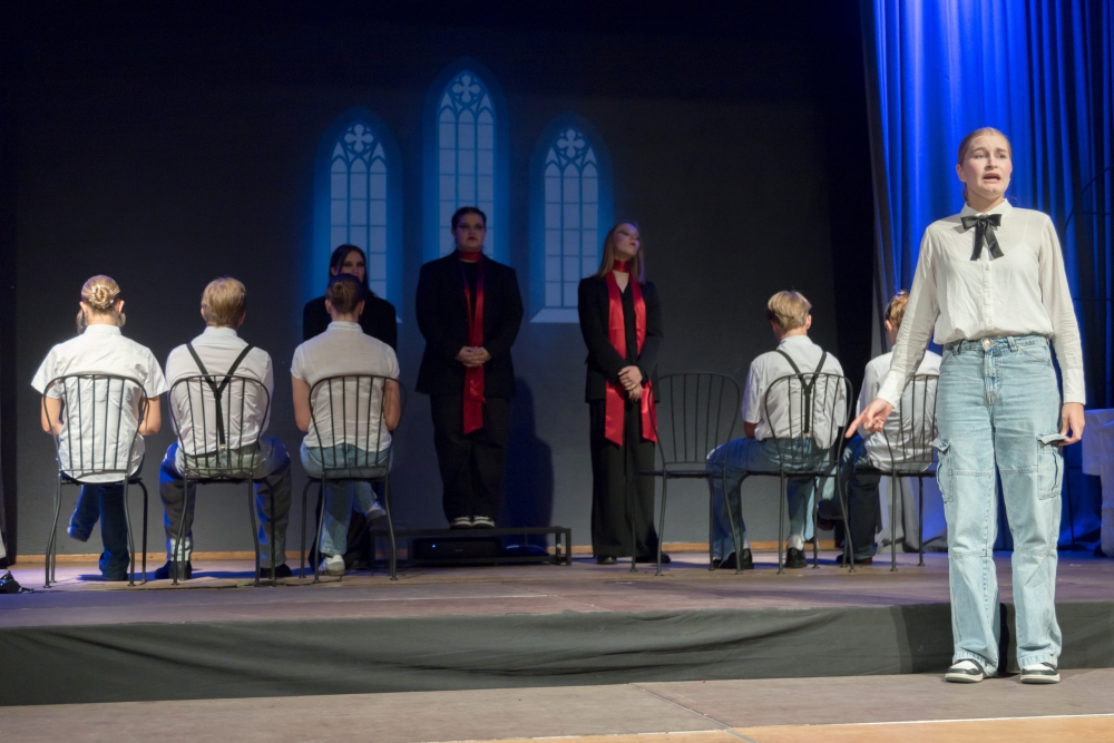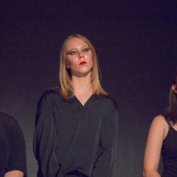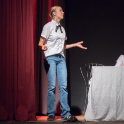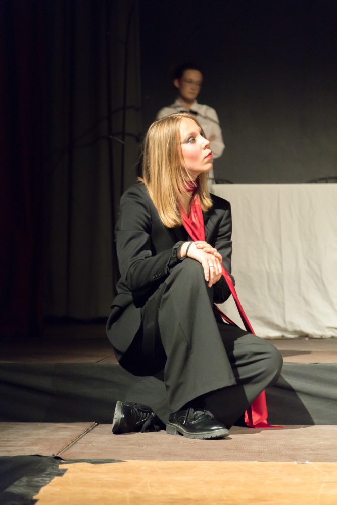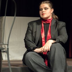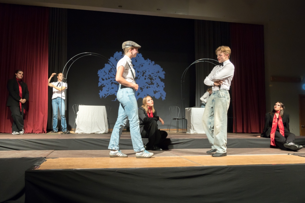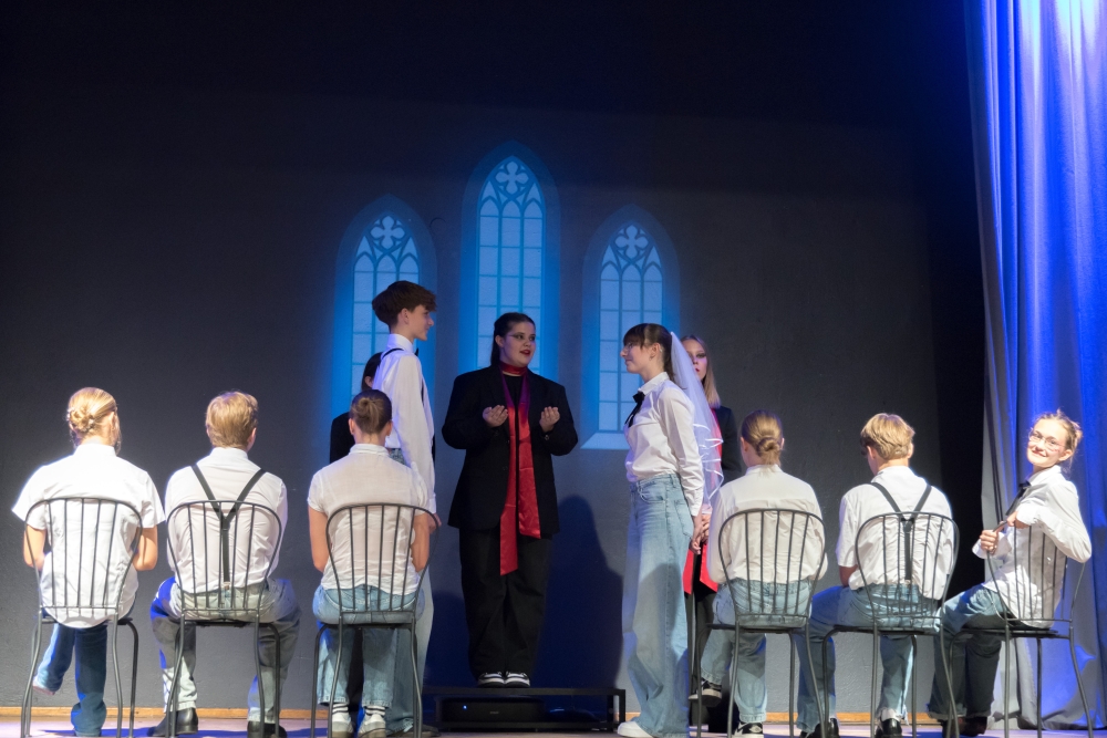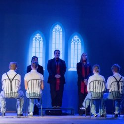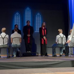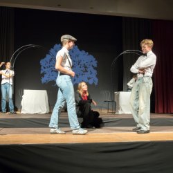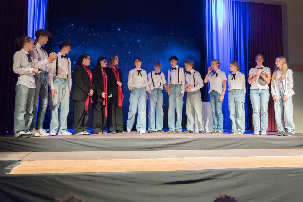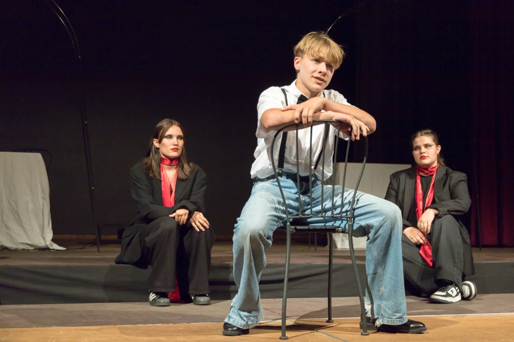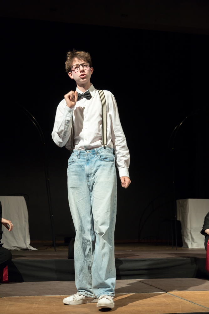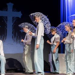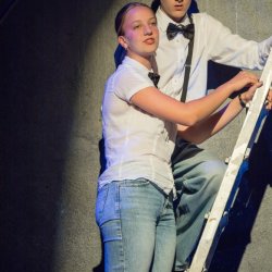 Unterstützt wird das auf wenige Requisiten reduzierte Setting der Stadt dann aber doch durch gekonnte Licht- und Tontechnik. So erscheint die Bühne – ja nach Stimmungslage – lichttechnisch verwandelt: Morgendämmerung, selbstverständliches Alltagslicht, aber auch romantische Abendstimmungen oder Trauerstimmung vermag das Technikteam mit Leichtigkeit (so scheint es jedenfalls) stets passend zu kreieren. Im Einsatz sind dieses Mal engagiert das Technikteam unter der Leitung von Noah Kießling, unterstützt von Jonas Ulrich. Aber auch die musikalische Untermalung des Stücks wird diesen Abend auf ganz besondere Weise gelingen: Yeva Kravets vermag es mit Hörspiel-Akustik stets für die passende Geräuschkulisse zu sorgen – so hört man beispielsweise das Spülen und Klappern von Geschirr oder aber nimmt den Aufprall geworfener Zeitungen war – und ist das nicht sogar eine Nachtigall, die da singt? Der Zuhörer lässt sich überraschen und ist gleichfalls erfreut über das einheitliche Dress der Städter (passend gewählt für die amerikanische Kleinstadt: Blue Jeans, weißes Hemd und schwarze Schleife) sowie das gekonnte Make-Up, das es schafft einen einheitlichen Akzent in die Gesichter der Städter zu zaubern, der nicht übertrieben, aber doch deutlich gleichförmig gestaltet ist. Josephine Zsigmond und Grete Staudigel zeichnen sich hinter der Bühne für dieses gelungene Spiel mit der Alltäglichkeit verantwortlich. Aber nun zurück zum Spiel: