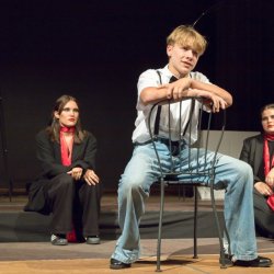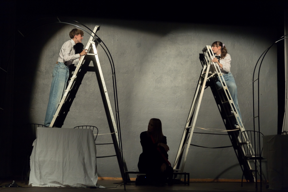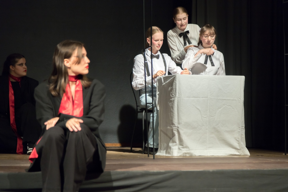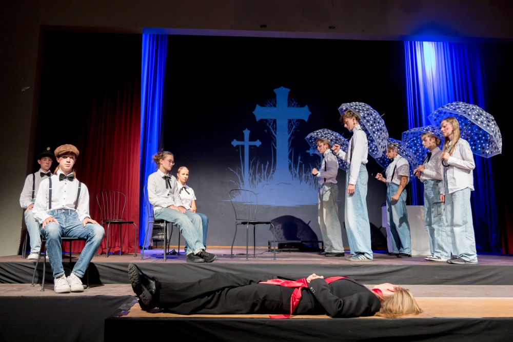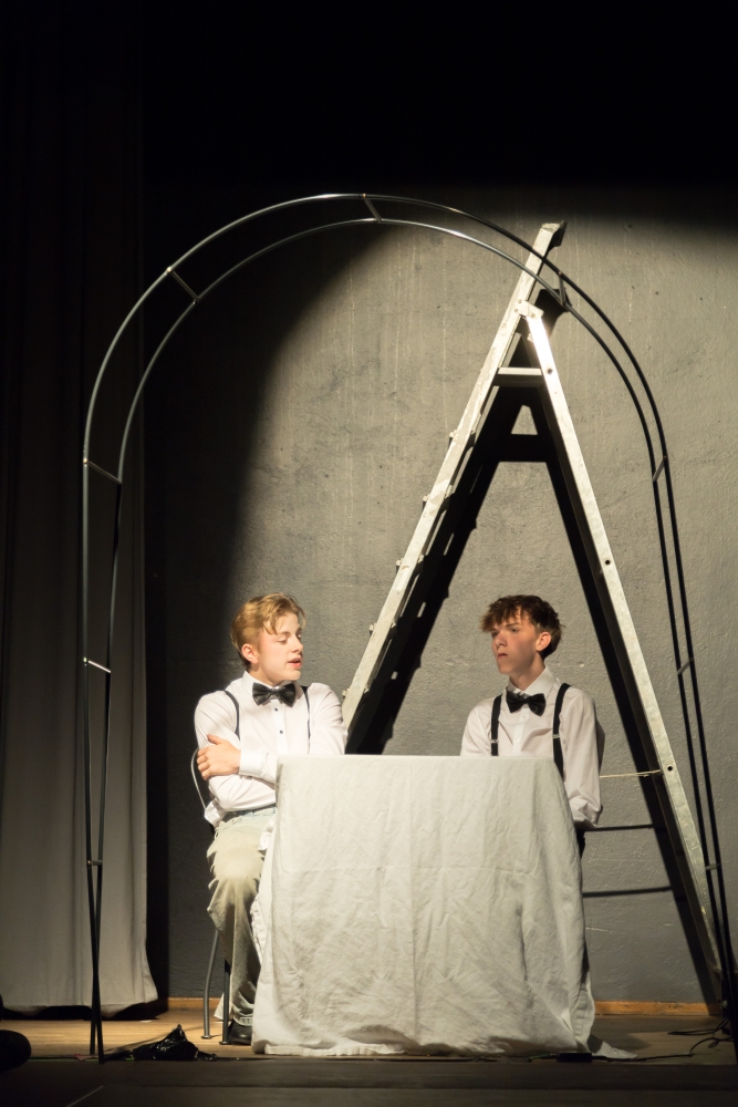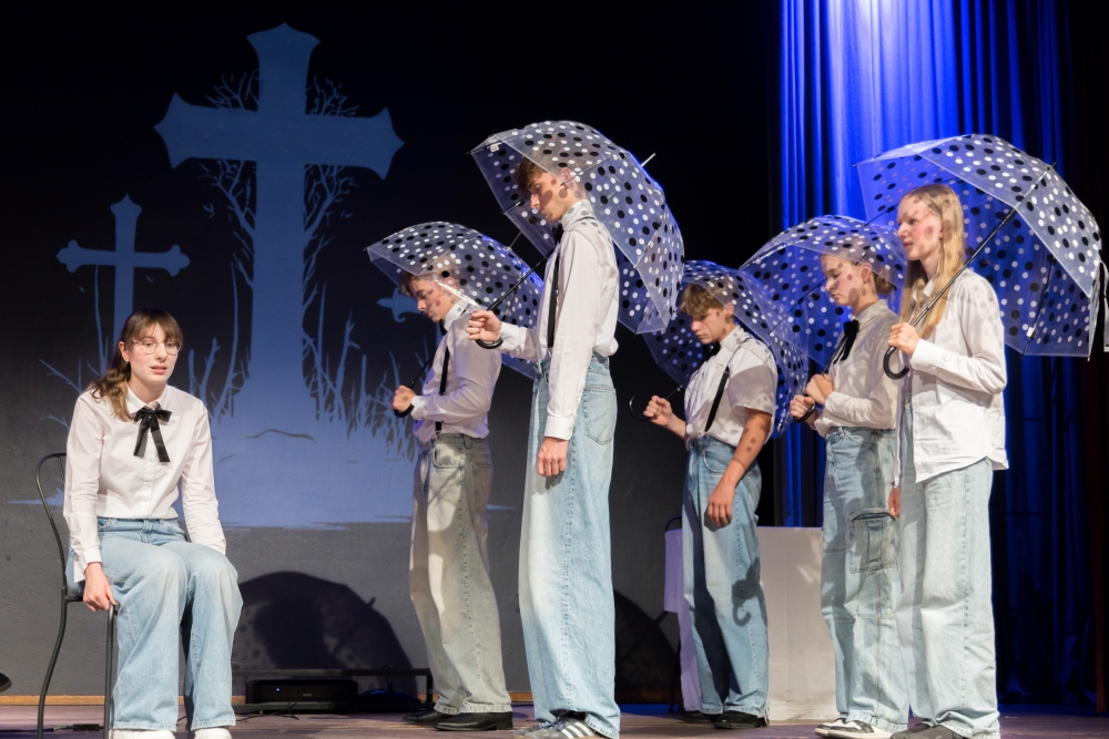 Menschen sind gestorben und vermögen in ihren Gräbern miteinander zu sprechen – und die Neuankömmlinge zu begrüßen: „Tief drinnen gibt es in jedem Menschen etwas, was ewig ist!“ Das soll nun auch die ebenfalls gestorbene Emily begreifen, die der Trauer der Zurückgebliebenen staunend begegnet. Sie will der Warnung der Toten (Justus Widmer, Ida Harrer, Theresia Schilling und Anton Franz spielen die Ernsthaftigkeit ihrer toten Rollen glaubhaft und gelassen) vor der Rückkehr ins Dasein keinen Glauben schenken: „Lebende sind in ihren kleinen Schachteln eingesperrt“ „Wie viele Probleme die Lebenden haben und wie dunkel es ist.“