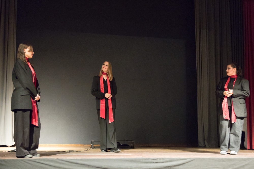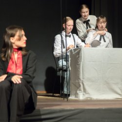 Die drei Spielleiterinnen, Ada Müller, Laura Postler und Maya Ossade, skizzieren im Folgenden zunächst den Aufbau der Stadt und machen uns nach und nach mit den darin lebenden Personen vertraut. Sprachlich ausgesprochen klar und deutlich und mit eindringlicher Intonation gelingt es den drei Spielleiterinnen gelassen und im scheinbar mühelos choreografierten Gang durch die (kulissenarme) Szenerie von Grovers´s Corner das Leben in dieser Stadt in unserer Imagination entstehen zu lassen. Dabei zeigen sie – antiken Seherinnen gleich – die wirklich wichtigen Fragen des Lebens auf – ganz im Nebenbei, von großer Würde und Gelassenheit geprägt.