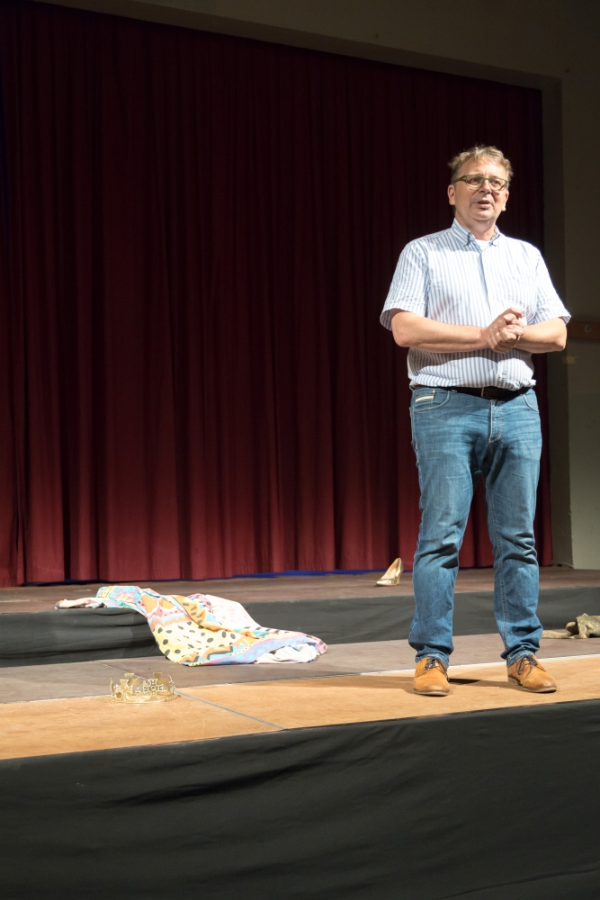 Wenige Requisiten auf der Vorbühne, ein geschlossener Bühnenvorhang – die Spannung steigt, als mit einem Mal drei schwarz gekleidete Personen mit markant roten Seiden-Schals die Bühne betreten und die wenigen Requisiten verschwinden lassen. Dafür öffnen sie den Bühnenvorhang und man sieht erst einmal – nichts. Man hört aber dafür mit einem Mal die angenehmen sonoren und klaren Stimmen der drei Spielleiterinnen, die das Publikum im Folgenden durch die Geschichte der kleinen Stadt Grover`s Corner führen. Dafür, so werden wir bald begreifen, braucht es – ganz im Sinne der Theatertheorie von Thornton Wilder, einem der bekanntesten US-amerikanischen Dramatiker und Romanautoren, - kaum Requisiten. Vielmehr steht das gesprochene Wort für sich und lässt Raum für Fantasie und das beginnende Spiel der vierzehn äußerst engagierten Schauspielerinnen und Schauspieler, die an diesem Abend in wechselnden Rollen der Stadt auf ansprechende Weise Leben einhauchen.