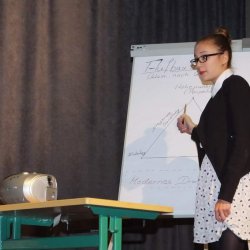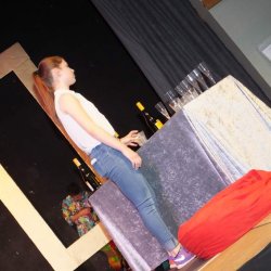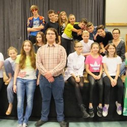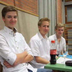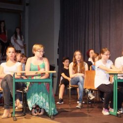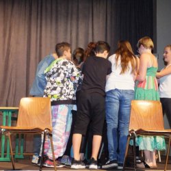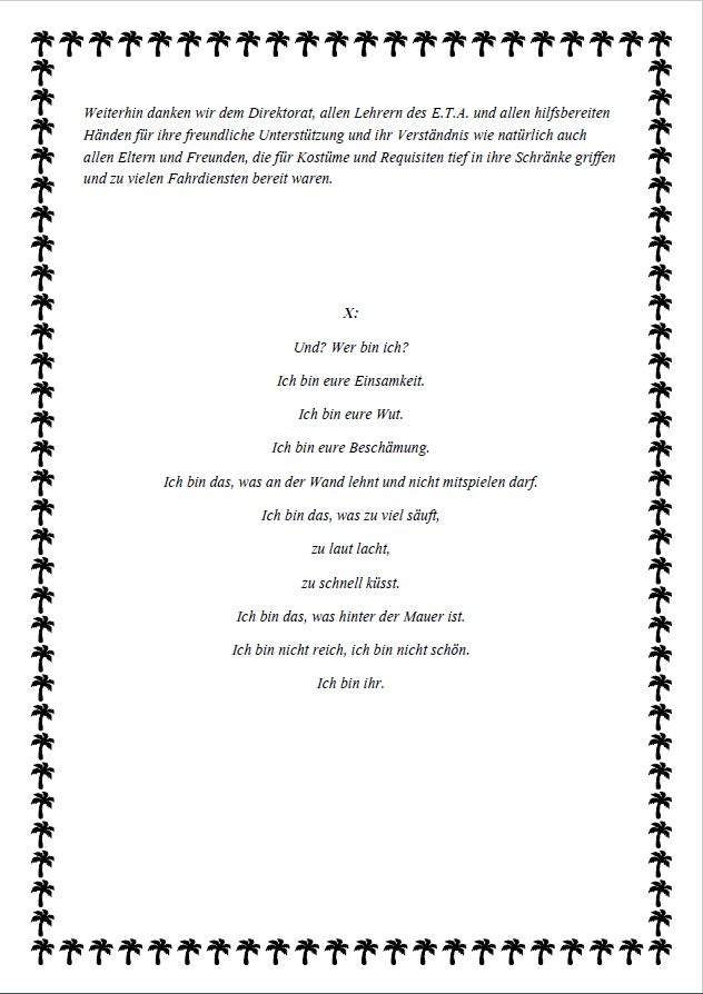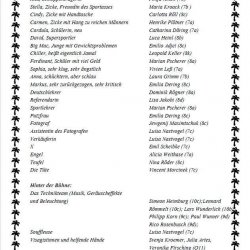 Anja Kießling hat sich mit ihrer ersten Inszenierung am E.T.A. Hoffmann-Gymnasium keinen leichten Stoff vorgenommen, zumal das Theaterstück ursprünglich für eine Oberstufentheaterbühne verfasst worden war. Aber sie ist diese Herausforderung angegangen und es hat sich gelohnt. Chapeau! Unterstützt wurde nicht nur sie, sondern die gesamte Truppe von den helfenden Händen von Svenja Kroemer, Julia Artes, Amelie Uhlig und Veronika Firsching als Visagistinnen, von Nicola Voit, die gemeinsam mit der Regisseurin die Verantwortung für Kostüme und Requisiten übernommen hatte, aber auch von Luisa Nastvogel als Souffleuse, die über manche „Hänger“ unbemerkt vom Publikum hinweghelfen konnte. Aber was wäre eine Theateraufführung ohne die Techniker: Wir alle säßen im Dunkeln und würden nichts hören. So sei dem wie gewohnt zuverlässigen Technikteam mit Simeon Heimburg, Lennard Römmelt, Lars Wunderlich, Philipp Korn, Paul Wunner und Rico Rosenbusch für ihr Engagement und ihren Einsatz einmal wieder herzlich gedankt.
