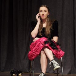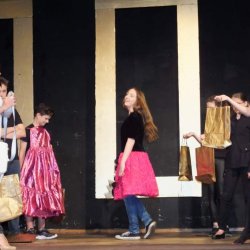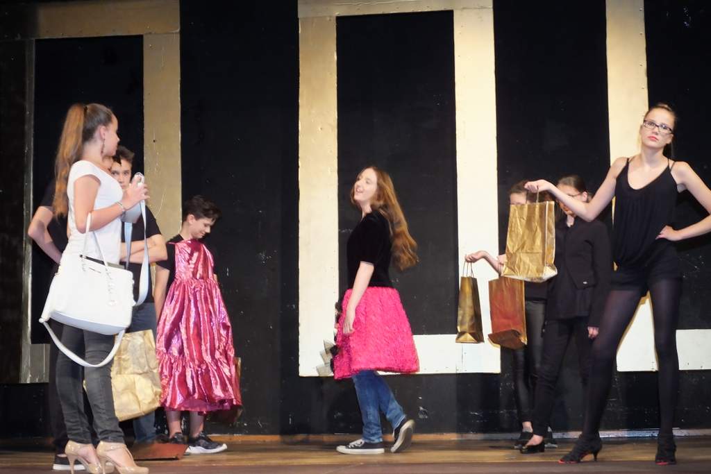 Zicken gibt es in diesem Stück recht viele, aber eine besondere Stellung nimmt sicherlich das vermeintliche Fotomodell Cindy ein, hochnäsig, andere kommandierend und bestimmend und sehr nachvollziehbar und äußerst anschaulich realisiert von Carlotta Röll und ihrer Handtasche. Besonders schlau scheint diese Cindy aber nicht zu sein, lässt sie sich doch von Jewgenij Maximtschuk, der wild gestikulierend, die Umwelt anschleimend den Fotografen darstellt, an der Nase herumführen, der ihr mit Hilfe seiner unterwürfigen und willfährigen Assistentin, Luisa Nastvogel, die wandlungsfähig später noch als Verkäuferin auftreten wird, 1000 Euro für ein Foto-Shooting aus der Tasche zieht. Interessanter allerdings ist Cindys scheinheilige, verlogene und wohl seit Kindergartentagen existierende „Freundschaft“ zu Rita, die im Programm abwertend als Schleppenträgerin bezeichnet wird. Leider dient sie ihrer Umgebung auch als solcher, sind es doch die Damen gewohnt, die unsichere, aber immer freundliche Mitschülerin (glaubhaft und immer in der Rolle bleibend von Fenja Amon gegeben), die sich in die Clique nur mit ihrem guten finanziellen Hintergrund einkaufen kann, auszunutzen.
