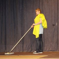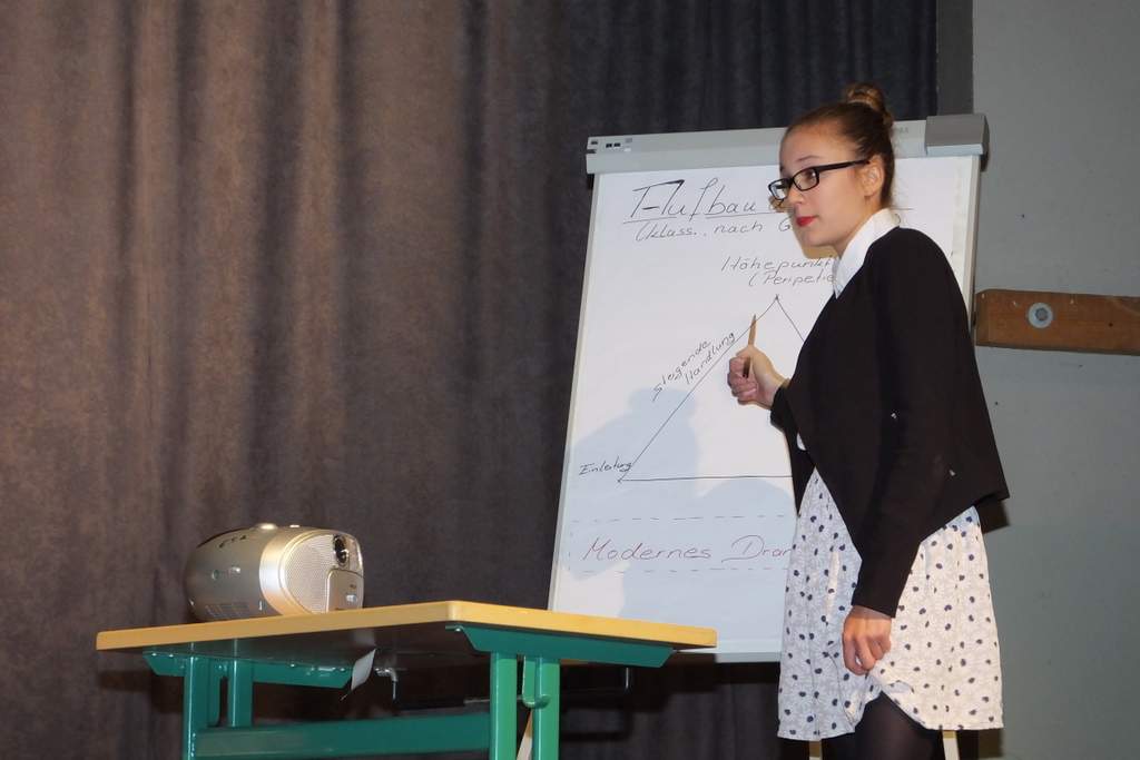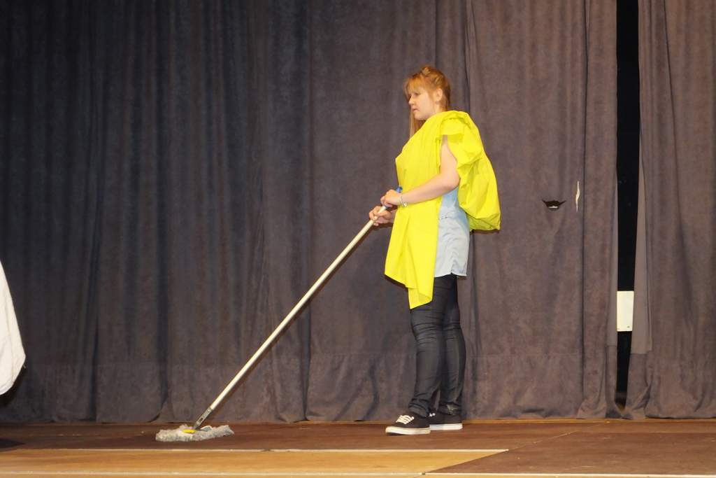 Aber kommen wir zurück zum Unterricht. Hier kann man sich über Situationskomik freuen, wird das Theaterstück doch in einer Seminarschule aufgeführt. Da überzeugt dann gänzlich der von Dominik Rögner mit sonorer Stimme agierende, recht gemütliche, aber auch äußerst konservative Deutschlehrer, der zumindest in den vielen Jahren seiner Arbeit gelernt hat, Arbeit zu delegieren. Und das macht er dann auch. Lisa Jakobi verkörpert – sowohl in ihrem Kostüm wie auch in ihrer sinnvoll überzeichneten Realisierung der Figur – eine Studienreferendarin, wie sie im Buche steht. Sie will dauernd motivieren, motivieren, motivieren. Da gibt es dann Gruppenarbeit, Stationenlernen und Vorträge vor der Klasse, die dann wider Erwarten gar nicht so begeistert ist von den modernen Methoden der Junglehrerin. An der wird es aber eher weniger liegen, sondern an der psychologischen Verfassung einzelner Mitglieder des Kurses, die teilweise schon vorgestellt wurden. Da ist noch der gechillte, am Lernen wahrlich nicht interessierte, im Unterricht saufende Jamal, den Leopold Keller gekonnt und sensibel mit allen vorhandenen Klischees über gescheiterte Jugendliche ausstattet. Da ist der zurückhaltende, interessierte, äußerst gesellschaftskritische Markus, der wohl auch etwas zu viel Che Guevara inhaliert hat, was Emilia Dering in einer Hosenrolle gut zum Ausdruck bringt. Sicher erheitert uns der dicke „BigMac“, wie er spöttisch, vielleicht manchmal aber sogar liebevoll von seinen Klassenkameraden und den Mädels genannt wird, den Emilio Adjei dauernd essend, mit einem selbstbewussten Lächeln dem Publikum vorstellt, damit aber auch die Tragik der Figur eindringlich zum Ausdruck bringt: Auch sie will Anerkennung durch die Gemeinschaft, auch wenn sie nicht dem vermeintlichen Ideal entspricht. Wegen BigMac streitet sich dann der junge, von Marian Pscherer cool und ambitioniert dargestellte Sportlehrer mit dem schon beschriebenen Deutschlehrer. Dieser bevorzugt in der Klasse eher die von Laura Grimm gespielte schüchterne, aber schlaue Anna, die nur durch ihr Wissen für sich eine gewisse Existenzberechtigung sieht, aber auch die äußerst kluge, jedoch ebenso ängstliche Sophia, die – von Vivien Leß wahrhaftig und echt charakterisiert – einfach nur unsichtbar werden möchte, um sich nicht mehr den Widrigkeiten des Lebens aussetzen zu müssen. Schlimm, wenn solches Denken schon in so jungen Jahren eine Rolle spielt. Da mag die neue Schülerin dann für viele Mauerblümchen ein Lichtblick sein. Von der Waldorfschule kommend, somit von Anfang an von allen Seiten großen Vorurteilen ausgesetzt, gleichwohl sie selbstironisch zugibt, ihren Namen tanzen zu können, brilliert Catharina Döring die Rolle voll und ganz ausfüllend, den Charakter der Figur in allen Facetten mit einer hohen Bühnenpräsenz beschreibend, als Cordula, die durch ihr Selbstbewusstsein, ihr Können und Wissen, aber auch durch ihre Ehrlichkeit so manch unterdrückter Seele in der Klasse wieder neuen Lebensmut schenkt – gleichwohl ist dem Zuschauer sehr wohl bewusst, dass auch sie nur geliebt werden möchte. Das Leben wird den Schülerinnen und Schülern in diesem Gymnasium sicher auch nicht leichter gemacht, wenn sie mit der Putzfrau in Kontakt kommen, die Emilia Dering herrisch, laut und dominant interpretiert.