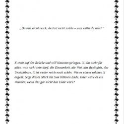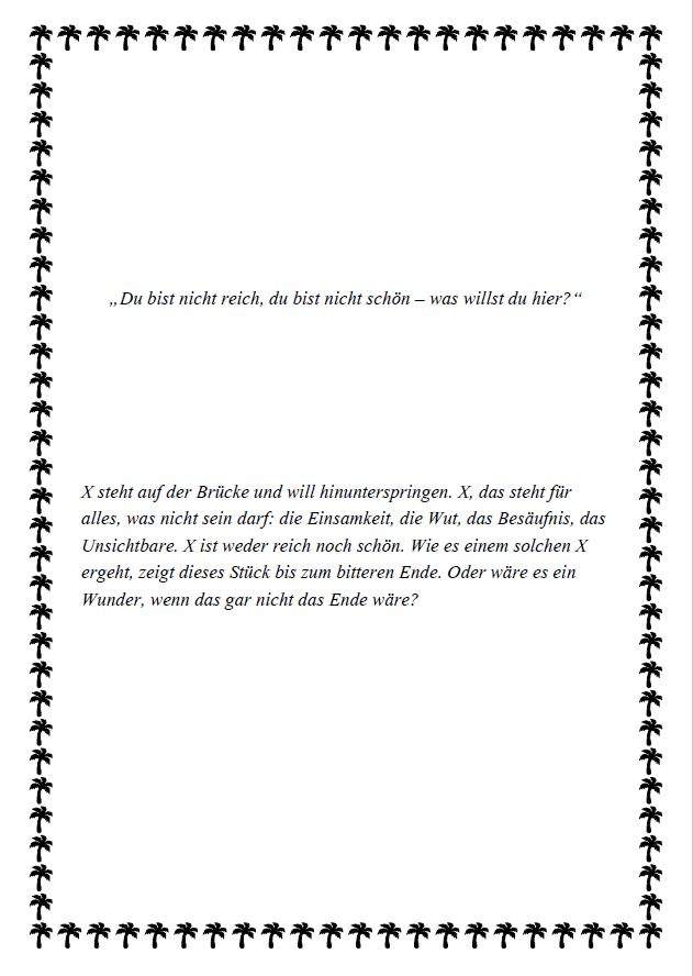 X steht auf der Brücke und will hinunterspringen. X, das steht für alles, was nicht sein darf: die Einsamkeit, die Wut, das Besäufnis, das Unsichtbare. X ist weder reich noch schön. Wie es einem solchen X ergeht, zeigt dieses Stück bis zum bitteren Ende. Oder wäre es ein Wunder, wenn das gar nicht das Ende wäre?