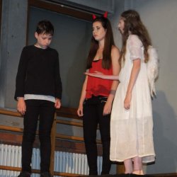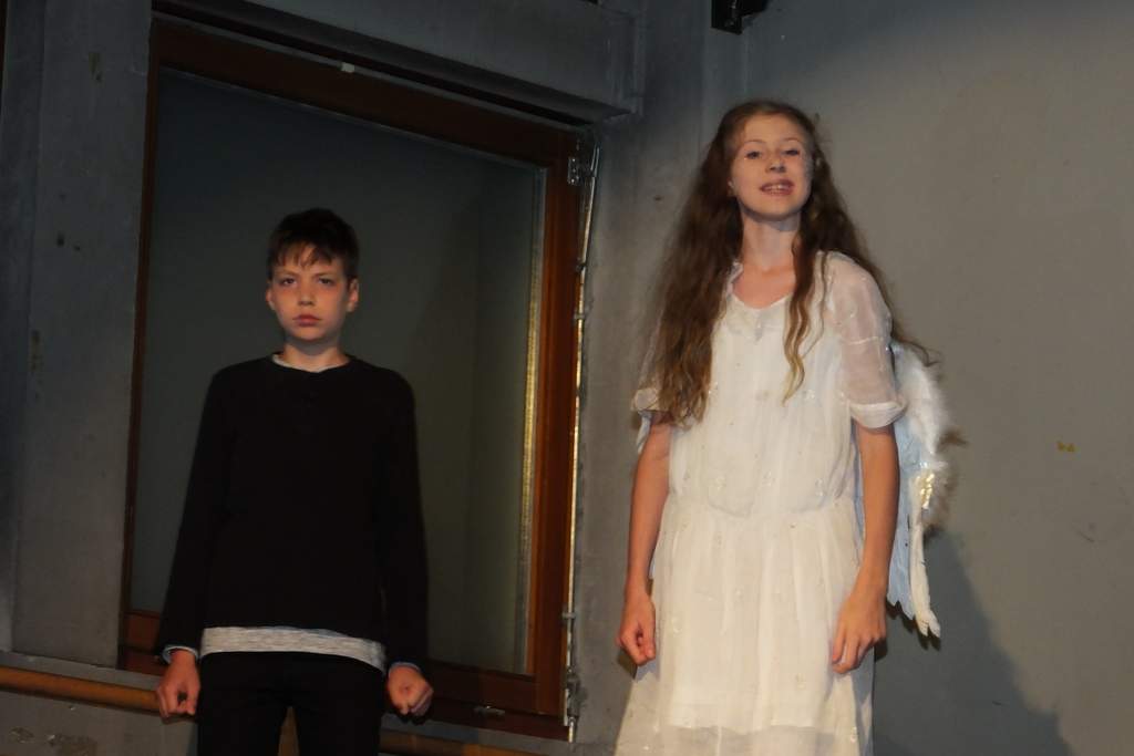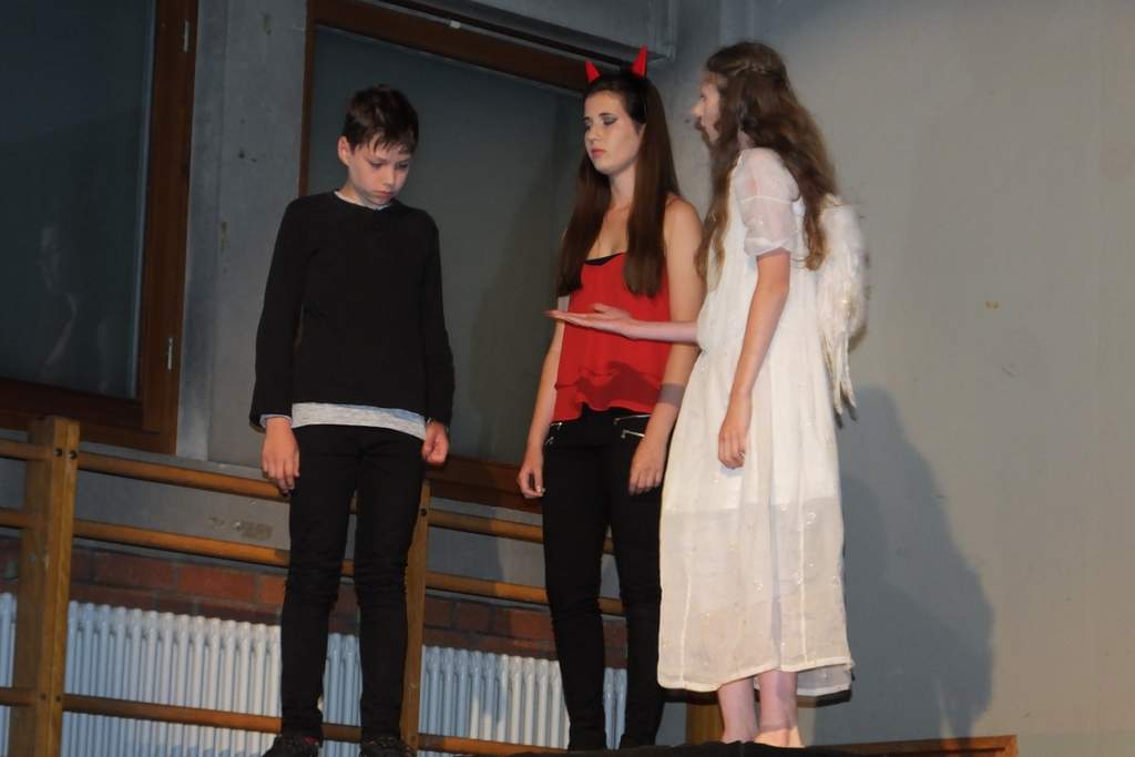 Der Auftakt des Theaterstücks unterstützt das Düstere des Stoffs: Ein Jugendlicher steht am Abgrund, ist verzweifelt, will in den Tod springen. Wer er ist, bleibt zunächst unklar, genannt wird er „X“, eindringlich und bedrückend verkörpert von Emil Scheibke, und warum er diese Verzweiflungstat begehen will, wird (noch) nicht thematisiert. Erst als sich ein recht naiver Engel, der die Welt in rosaroten Farben sieht, authentisch und die Rolle gekonnt karikierend von Alicia Weithase gespielt, mit dem gewieften und bauernschlauen Teufel, intensiv und herrlich teuflisch von Nina Röder interpretiert, in einem Ethik-Wettstreit um den Sinn des Daseins befindet, werden die Probleme des Jungen nach und nach enthüllt.