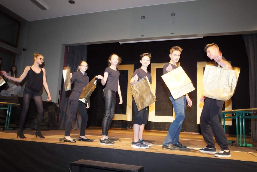 Die Theatergruppe der Unter- und Mittelstufe regt mit Eva Vieths „Reich und schön“ teils ironisch, teils tragikomisch, aber auch schockierend zum Nachdenken an.