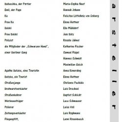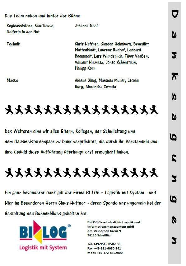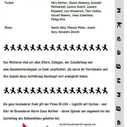Die Schauspieler der Unterstufenbühne vermittelten ihre Spielfreude, ihren Witz und ihre Motivation so überzeugend, dass der Funke auf das Publikum übersprang und die eineinhalb Stunden wie im Fluge vergingen. Zum Erfolg beigetragen haben natürlich auch die versierten Techniker (Chris Haffner, Simeon Heimburg, Benedikt Mattenklodt, Laurenz Rudrof, Lennard Roemmelt, Lars Wunderlich, Tibor Vaaßen, Vincent Niemetz, Jonas Schmittlein, Philipp Korn) sowie die für die Maske zuständigen Amelie Uhlig, Manuela Müller, Jasmin Burg und Alexandra Zwosta. Besonderen Applaus bekam jedoch Johanna Neef, die nicht nur als (arbeitslose) Souffleuse fungierte, sondern vor allem als Regieassistentin erneut unentbehrlich geworden ist. Herr Schreiner hat mit einer guten Truppe wieder einmal unter Beweis gestellt, dass Unterstufentheater unterhaltsam und anspruchsvoll sein kann. Dafür gab es viel verdienten Beifall.