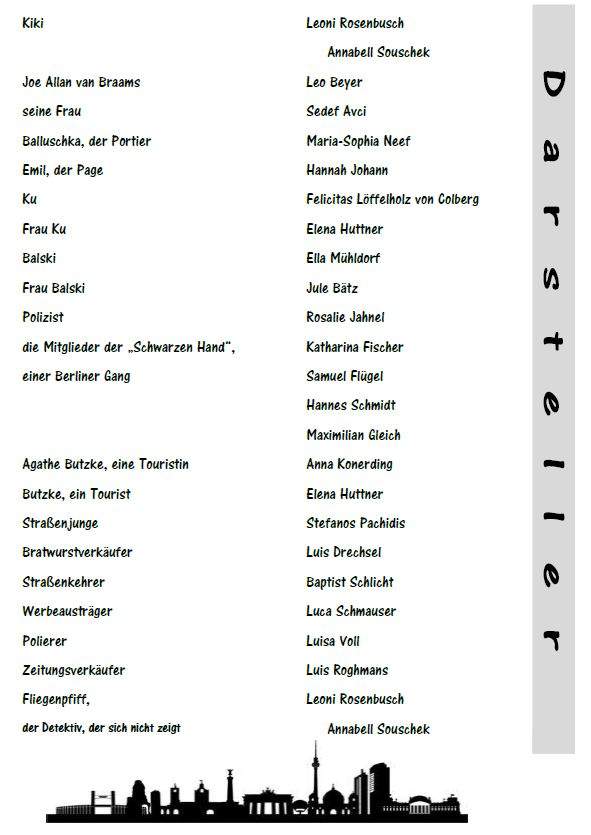 Klar, dass Kiki sich diese Herausforderung nicht entgehen lässt – und nun lernen wir erst mal ihre Gang kennen: Katharina Fischer, Samuel Flügel, Hannes Schmidt und Maximilian Gleich sind richtige Lausejungs, die mit einer Mischung aus Berliner Schnauze und Jugendslang alles durcheinander bringen. Keiner ist vor ihnen sicher: Nicht der Bratwurstverkäufer, der herrlich berlinernd und verschlagen von Luis Drechsel gespielt wurde, nicht der von Baptist Schlicht sehr besonnen, aber mit der nötigen Ruhe ausgestattete Straßenkehrer, und auch nicht der wegen der Frechheit der Jungs schon beinahe verzweifelt von Luca Schmauser gegebene Werbeausträger. Diese Gang schafft es also, die Stadt mit Bildern von schwarzen Händen so zuzupflastern, dass es Mr Allan gar nicht entgehen kann – sogar auf Statuen und Personen finden sich schwarze Hände. Einzig der Polierer (bemitleidenswert, aber dennoch stoisch Luisa Voll) und natürlich der Wachtmeister sind nicht zu beneiden, denn sie müssen sich um die schwarzen Hände und ihre Verursacher kümmern. Als Wachtmeister brilliert Rosalie Jahnel, sehr energisch und mit bewundernswertem Berliner Dialekt.