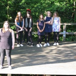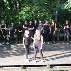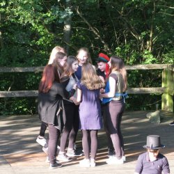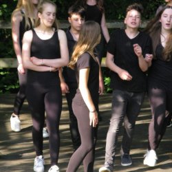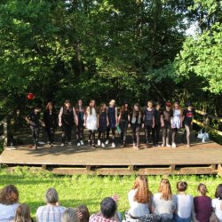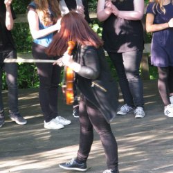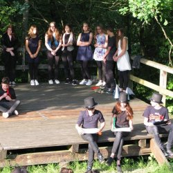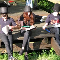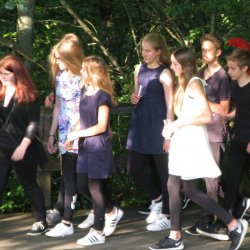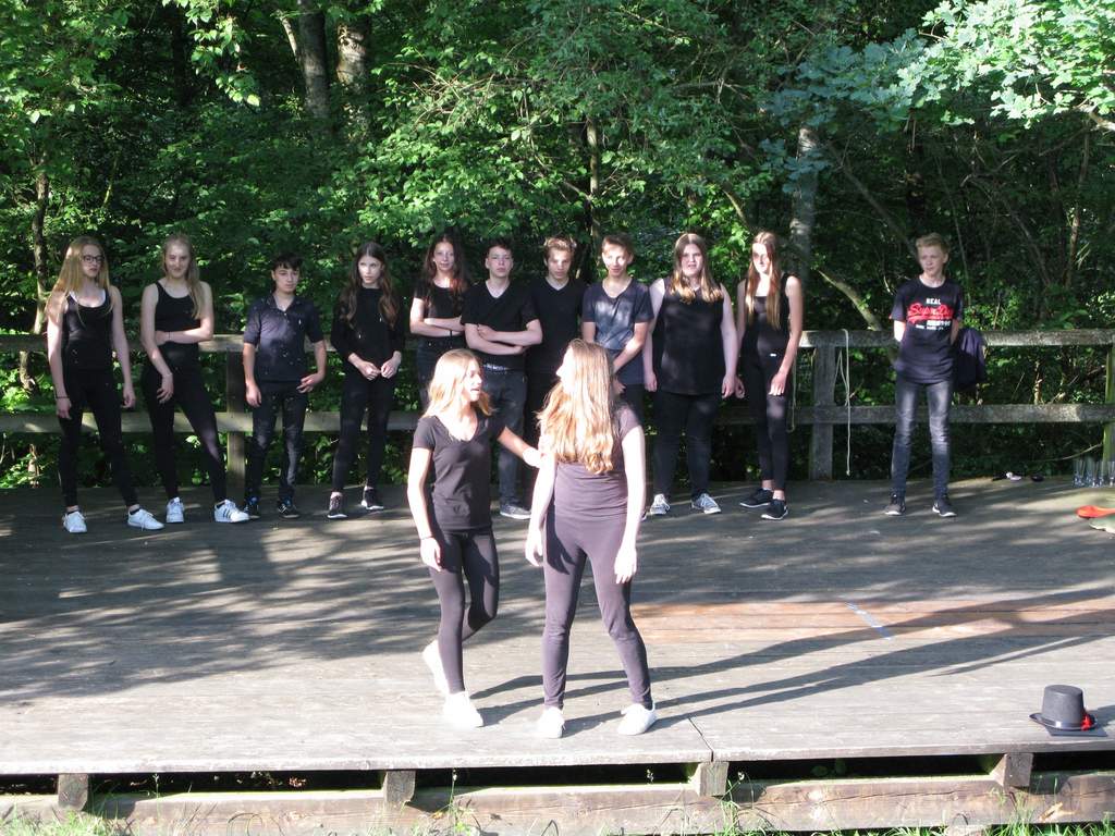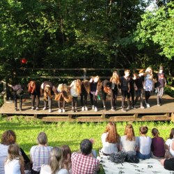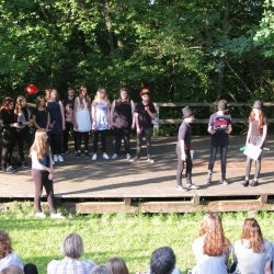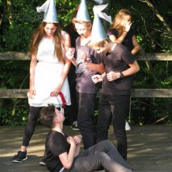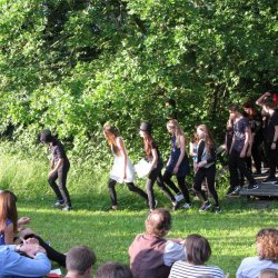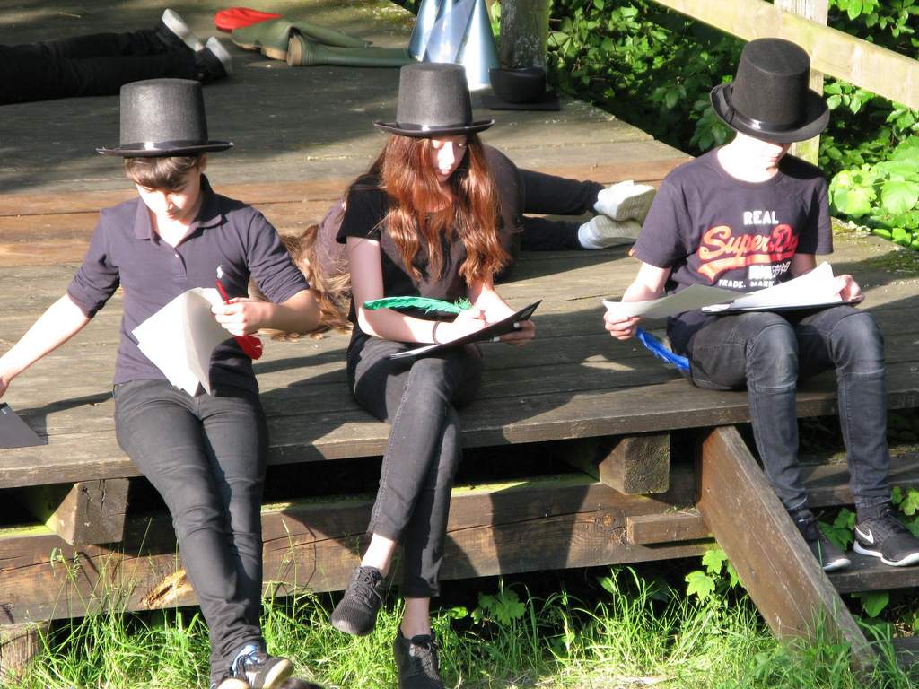 Hier kam das Können der Theatergruppe der achten Jahrgangsstufe zum Tragen und Anja Kießling konnte zeigen, dass sie nicht nur im düsteren Fach ein Meister ist. Auf der Waldbühne unterhalb des Hartplatzes konnte man nunmehr in idyllischer Umgebung einiges über den Poeten erfahren, dem der ganze Abend gewidmet war. Und dies geschah auf sehr angenehme und witzige Art und Weise. Der Zuhörer, zu Beginn aber vor allem der Zuhörer, erfährt viel über das facettenreiche Leben eines Mannes, des Schattenseiten durchaus auch bekannt sind. „Mir geht es so wie vielen, die weit besser wissen, wofür sie die Leute halten, als was sie eigentlich sind!“, so beklagt sich Ernst Theodor Amadeus über die oberflächliche Beurteilung seiner Person durch die Außenwelt. Er, der jetzt Musikunterricht geben muss, weil er kein Geld mehr hat. Er, der Liebhaber, Alkoholiker, Frauenheld, Musiklehrer, Dichter. Er, der vielleicht ein bisschen zu sehr in sich selbst verliebt ist, weil er meint, so in so vielen Bereichen so talentiert zu sein – oder es vielleicht sogar ist. Diesen Fragen, diesen Widersprüchen, diesen Schnappschüssen aus dem Leben eines Menschen gehen die Schauspieler nach, geben Einblicke, zeigen auf, was Hoffmann ist, was er sein wollte, was er nicht ist, was er doch sein wollte, was er meinte, gewesen zu sein. Er, der sich in seiner künstlerischen Rolle nicht zurecht fand und dann doch von der Juristerei leben musste. Ob er das verdient hat? Die Antwort wird natürlich nicht gegeben. Auch bei dieser szenischen Kurzautobiographie kann der Theatergast seiner Phantasie freien Lauf lassen, kann sich selbst eine Meinung bilden. Aber natürlich darf uns E.T.A. Hoffmann selbst eine Geschichte erzählen. Wenngleich er hier auch im inneren Widerstreit seiner selbst steht. Mit Zylinder schreibt, malt und komponiert er das Kunstmärchen „Klein Zaches, genannt Zinnober“ aus dem Jahre 1819, welches zeitgleich auf den Brettern, die die Welt bedeuten, pantomimisch, dialogisch und mimisch perfekt dargeboten wird. Allerdings erfahren wird nicht den Ausgang der Handlung, da der Dichter den mystischen Zauber brechen und lieber etwas trinken gehen will. An einem ausnahmsweise einmal lauen Sommerabend eine durchaus nachvollziehbare Idee.