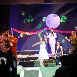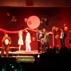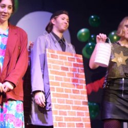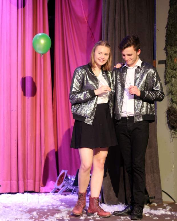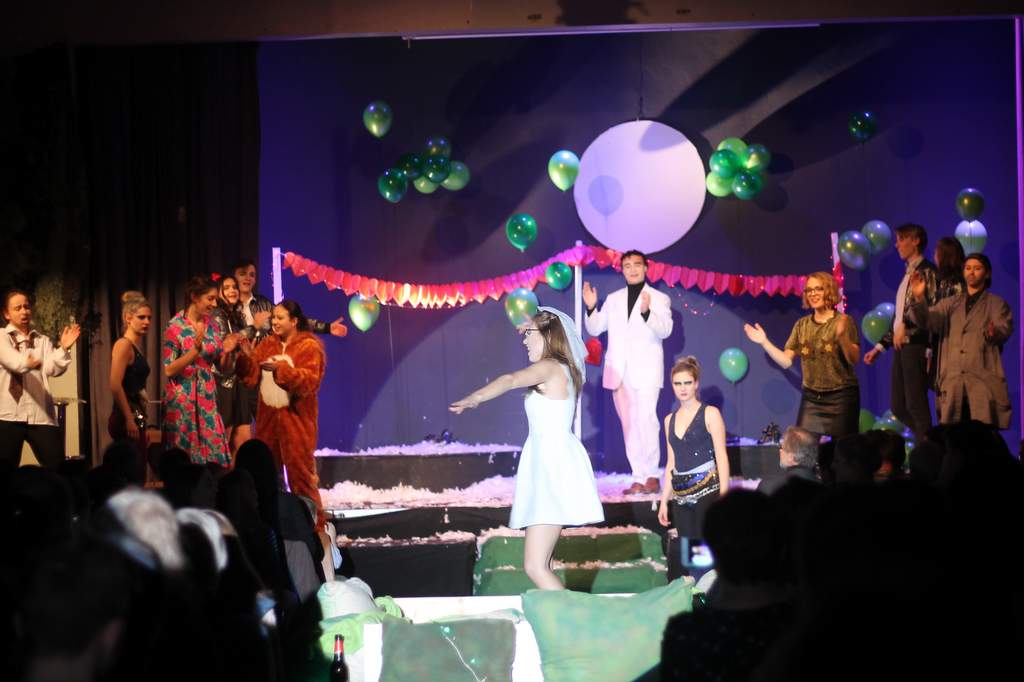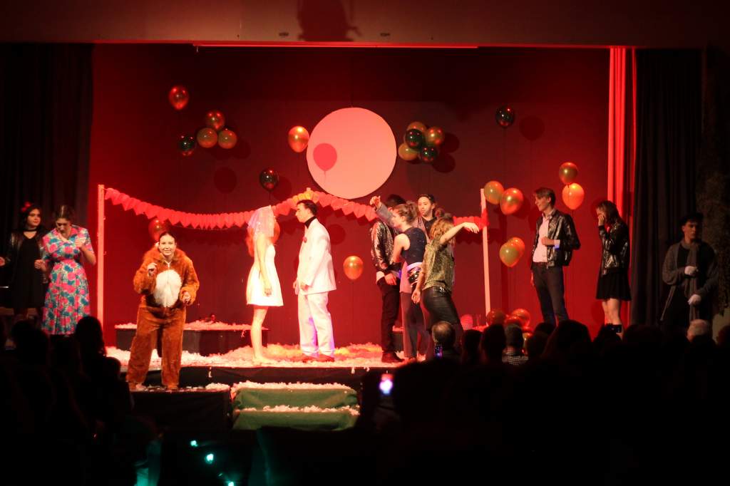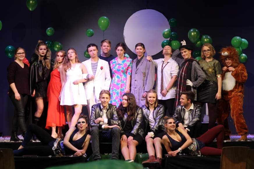 Eine tolle, äußerst witzige und kurzweilige Aufführung findet ihr Ende. Martin Stübinger gelang es wieder einmal hervorragend und überzeugend, ein spielerisch anspruchsvolles Stück mit einer großen und motivierten Schauspielgruppe zu inszenieren. Professionell unterstützt wurde er hierbei von Olga Schmidt, die auch für die Einstudierung der Tanzeinlagen verantwortlich zeichnet und von Marie-Luise Frank, die sich um die Gesamtorganisation hinter den Kulissen kümmerte. Hinzu kommt das Bühnenbild, das von Maura Büttner, Philipp Korn, Marie-Luise Frank und Anna Lenger detailverliebt und abwechslungsreich gestaltet wurde. Die letzten beiden trugen auch Verantwortung für die Kostüme, die für jeden Charakter äußerst passend ausgewählt worden waren. Alle Protagonisten wurden hervorragend von Sophia Schmaus, Anna Lenger und Hannah Schlüter geschminkt. Karolina Beli gab dem Ensemble konzentriert als Souffleuse die nötige Sicherheit. Nicht zu vergessen aber ist die Technik. Ruhig und konzentriert im Hintergrund agierend, den Wünschen und Vorgaben des Regisseurs stets gerecht werdend, konnten Philipp Korn, Rico Rosenbusch und Paul Wunner mit einfallsreichen Licht- und Toneffekten ihr Können unter Beweis stellen.