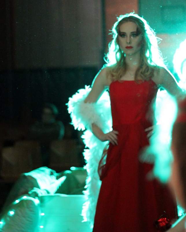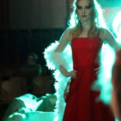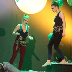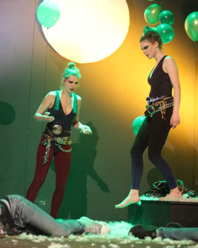 Dem aber nicht genug. Im Elfenreich herrscht wohl Streit, denn die beiden Königinnen zoffen sich um eine sehr banale Sache – ein Kleid. Die Rolle der in dieser Inszenierung weiblichen Oberon ist Sophia Schmaus wahrlich auf den Leib geschrieben. Den Vamp im Lederkostüm verkörpert sie gekonnt. Shakespeare hätte seine Freude an dieser Darbietung gehabt, nur durften damals keine Frauen spielen. Wer "die" Schmaus mit ihrem Sexappeal, ihrer Macht, Raffinesse und Hinterhältigkeit nicht gesehen hat, hat etwas verpasst. Pia Kröner ist der wohl geeignetste Gegenpart für die Rolle der Titania, muss diese doch auch mit einem stinkenden Esel in die Kiste, was jene in der Rückschau nicht erfreut, was diese aber glänzend auf die Bretter, die die Welt bedeuten, bringt. Der inmitten einer mit Tausenden von Federn gestalteten Waldlandschaft listige, schelmisch-närrisch agierende Puck als Diener seines Herren wird mit vollem körperlichen, gestischen und mimischen Einsatz von Franka Heinlein und Esther Wagner gespielt, wobei diese hervorragend miteinander korrespondieren und so zur Symbiose des Oberonschen Adjutanten werden. Sie werden träufelnd durch die Gegend rennen, Zaubernektar verteilen, der den Liebenden die Sinne verdreht und den Verstand raubt. Unterstützung finden die Protagonisten des Zauberreiches durch viele kleine, entzückende Elfen, die durch die Gegend schwirren, um tanzend und singend den Wünschen ihrer Herren gerecht zu werden. Isabella Starklauf, Filippa Bergmann, Julia Herter, Nike Opover, Samira Ben Khelil, Zsusanna Marki-Zay und Jennifer Hoffmann zeigen in jedem Moment, welche Freude sie am verzauberten Spiel haben.