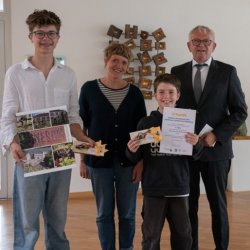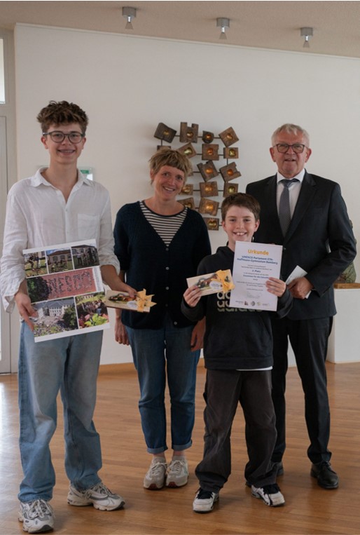 Das ETA gewinnt mit den Bamberger Berufsschulen und dem FLG die ersten Preise. Die UNESCO-Vorstände Lasse und Leo durften die Urkunde und das schön aufgezogene Gewinnerbild mit einer fairen Tafel Schokolade entgegennehmen.