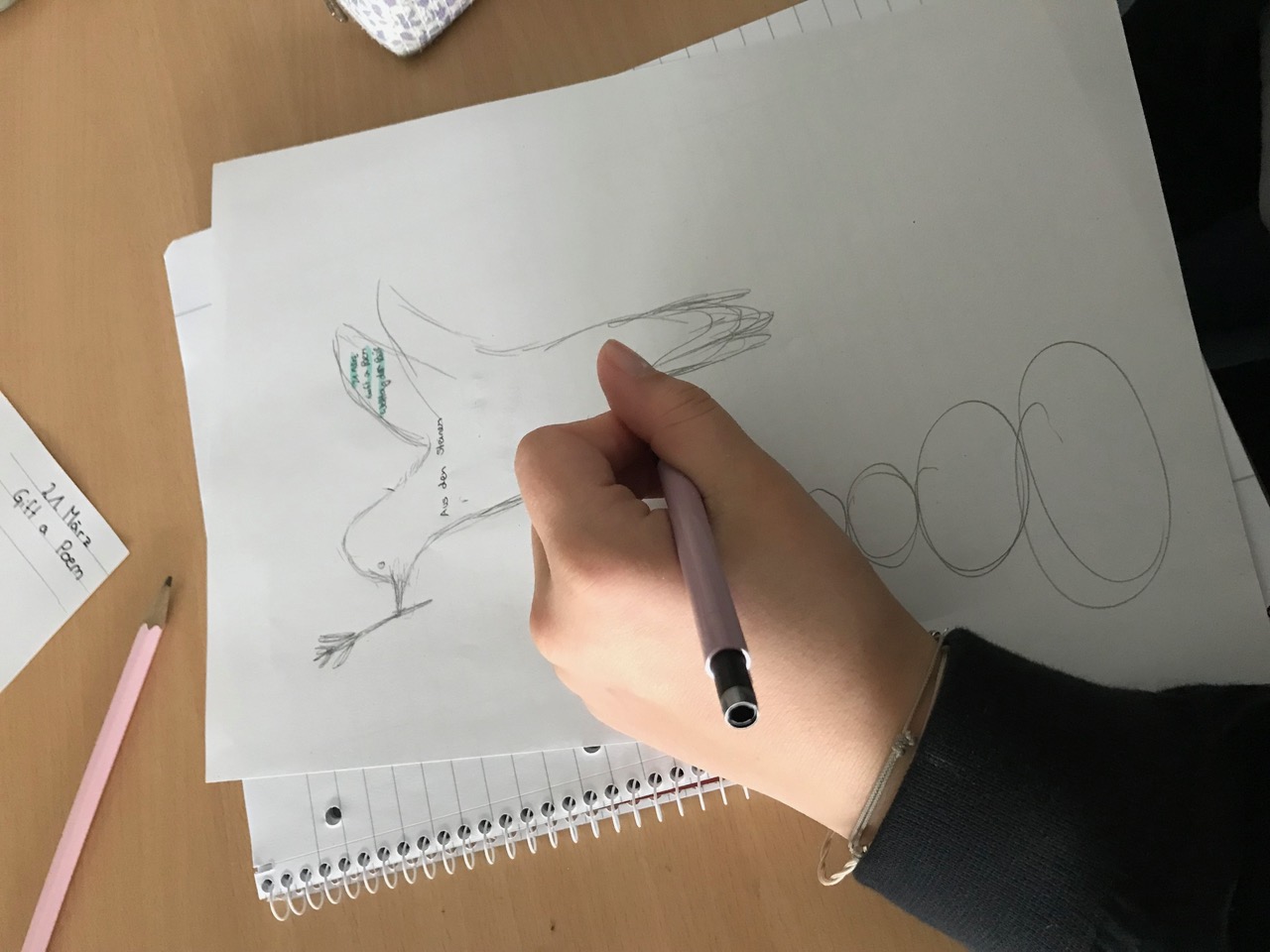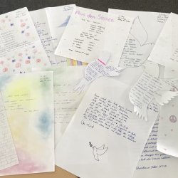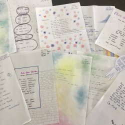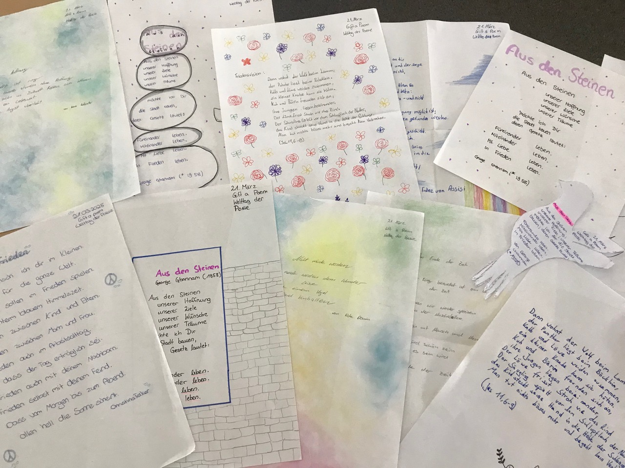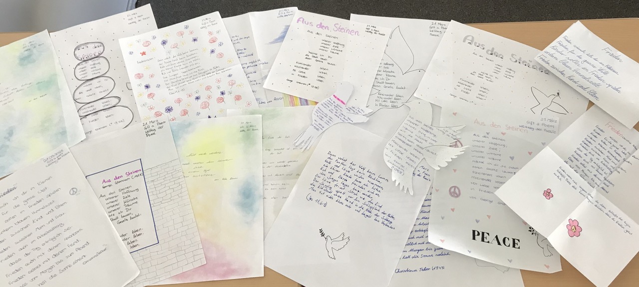 Neben den alttestamentlichen Texten wählten die Schülerinnen und Schüler auch zeitgenössische Gedichte aus, die das Thema Frieden aufgreifen. Diese schrieben sie von Hand ab und gestalteten sie liebevoll als kleine Geschenke für Unbekannte.